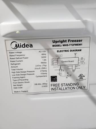Midea upright freezer which can be changed over with a touch of a few buttons to a refrigerator."Garage Friendly" meaning it can be used in an uninsulated with no heat in a garage in the winter and in the summer with no air cond. I purchased this in Oct. of 2021. Since then I have used this approximately 2 1/2 years total. When not in use I kept it unplugged. Total Volume of 21 cu.ft. . Very clean, like new. Cash Only! You Load it. I have a bad back. (Door handle is on the left side of door) In Owensville, Indiana.