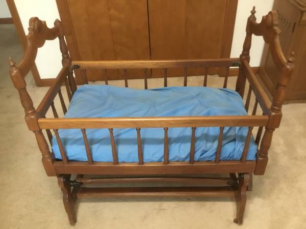Antique Walnut foot operated rocking cradle over 100 years old. One finial missing, otherwise very nice working condition with mattress. $100 cash