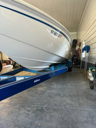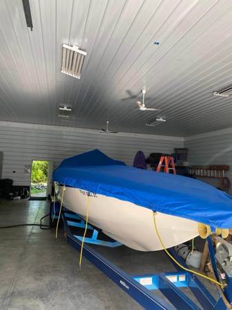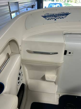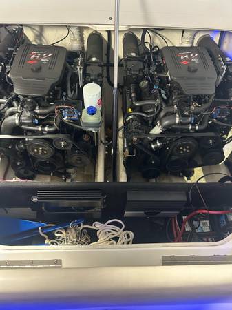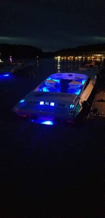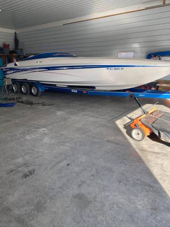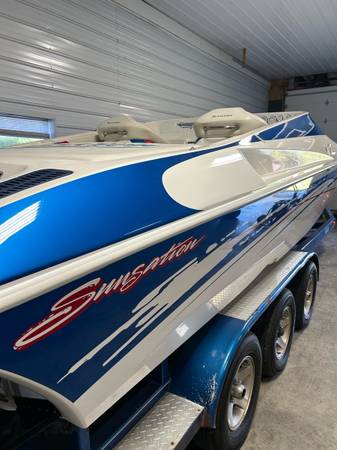 2004 Sunsation 32 Dominator with Mercruiser MX 6.2L 320hp, Mercruiser Bravo One outdrive, 710 FRESHWATER hours, Mercury Bravo props, drive showers, trim tabs, Gaffrig controls, Gaffrig gauges, Garmin GPS, freshwater tank, 100 gal fuel tank, refrigerator, sink, pump out toilet, blue LED interior/underwater lighting, bimini top, cockpit cover and front cover that zips to make a full cover. Recent tune up and water pump service. Cruises 45-50 MPH and runs 72 MPH on top end. Sits on a Manning tri axle steel trailer with custom aluminum wheels, surge disc brakes and new tires. Located in Evansville, IN asking $66,900
