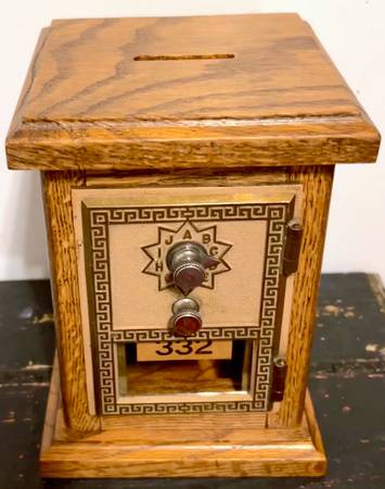 The vintage US Mail Box Door Combination Lock Oak Coin Bank from 1965 by Corbin is a collectible piece made of wood in the United States. This original PO Box door was removed from the post office in Lynnville, Indiana and converted to be used as coin/piggy bank. The intricate design and historical significance make it a unique and nostalgic addition to any collection of vintage banking or postal memorabilia. It comes just as pictured, measures 7.5" x 5.5" x 5.5" and can be opened with the combination.