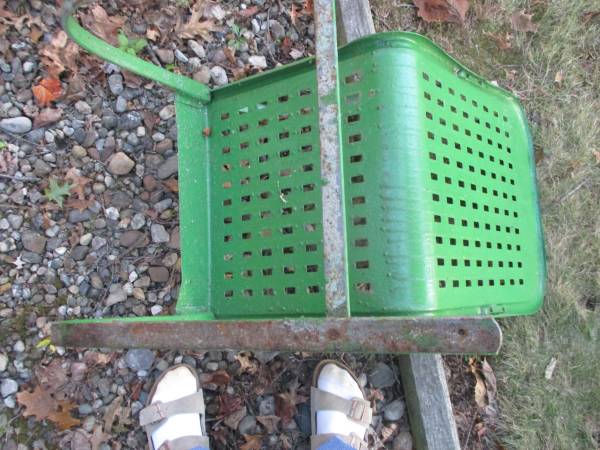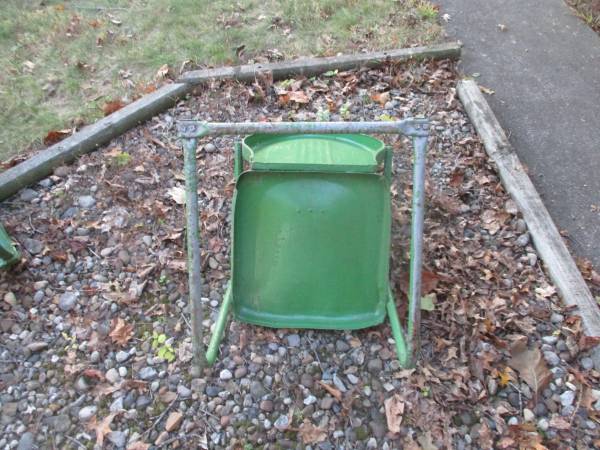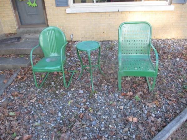 Metal lawn chairs from 50's primed and painted, heavy duty. Will last a long time just paint with rust proof paint every few years. Small table too