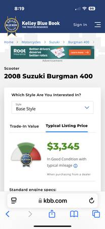 2008 Suzuki burgman 400. Fuel injection, automatic, good tires, very good shape, 16,xxx miles. It can be seen at 3124 myers vista dr. On west side of Evansville. Cash only and NO text or emails,...