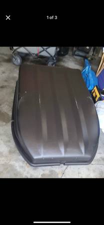 Approximately 48" X 31" X 13", new hardware for mounting to crossbars, 2 keys. Missing the front latch, but we use a zip tie which works great.