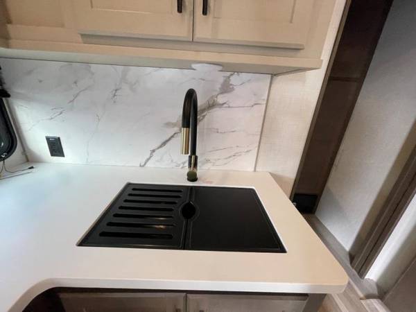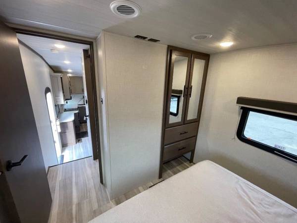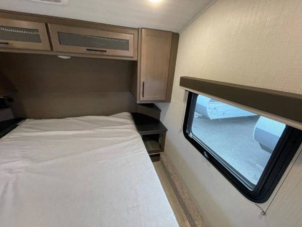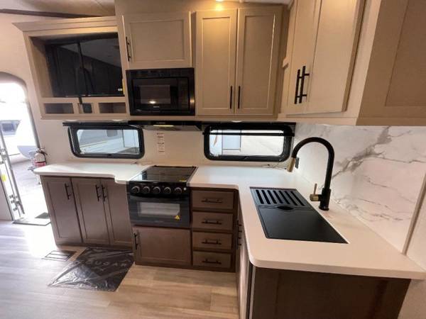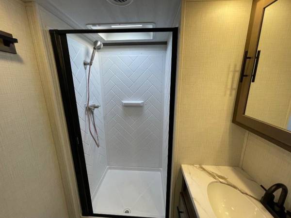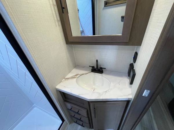 The Cougar Sport structural I-beam frame with stamped steel cross-members and outriggers, plus its AlphaPly roof membrane are what active RVers love about the construction of the Cougar line. The Cougar Sport models are no exception when it comes to a great package, as well as being smaller and lighter weight than their big brother Cougar models. A one-piece, heated and enclosed polypropylene underbelly will add protection against the elements, and the electric stabilizer jacks will provide more stability. On the inside, residential shaker style hardwood cabinet doors and decorative crown molding, plus seamless pressed countertops and an on-demand water heater will make your unit feel even more like home. You are also sure to appreciate the shiplap style decorative accent wall behind the bed, a porcelain foot flush toilet in the bathroom, plus residential kitchen hardware, and so much more.