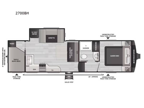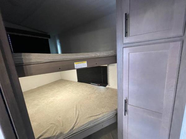This lightweight Cougar Sport bunk model features sleeping for ten or more with triple stacked bed bunks in the rear bunkhouse, a large U-shaped dinette that can be transformed into sleep space, as well as a tri-fold sofa sleeper and a queen bed in the private bedroom up front. A fully equipped kitchen with an overhead microwave, a three burner range, and large sink plus storage will make it easy to keep everyone fed and happy. A 10.4 Cu. Ft. 12 volt refrigerator will keep all of your perishable items fresh, and there are plenty of cabinets for storing snacks and dry goods as well. Head up the steps to the bathroom featuring a shower with a skylight, sink with an overhead medicine cabinet, and toilet. The private front bedroom takes you away from the hustle and bustle of the main living area and bunkhouse to provide a relaxing retreat including a comfy queen bed, dual nightstands and a wardrobe for clothes!