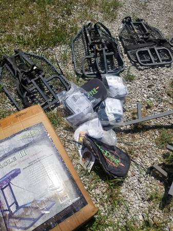 beagle hunting stand with climbing sticks one has ladder have seats and safety harness $60 for stand and stick set or $120 for all. 2 available cash sale you pick up please text