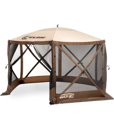 CLAM Pop up Outdoor Camping Gazebo. This Heavy Duty portable screened shelter with netting is Made of 210 denier poly Oxford. Dimensions are 140”Lx140”Wx90”H, weighs 32lbs, Fiberglass frame. This spacious shelter accommodates up to 6 people, fits camping tables and chairs. No see um mesh screen and extra wide skirt keeps bugs out. Includes carry bag and privacy panels.