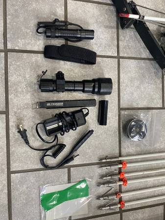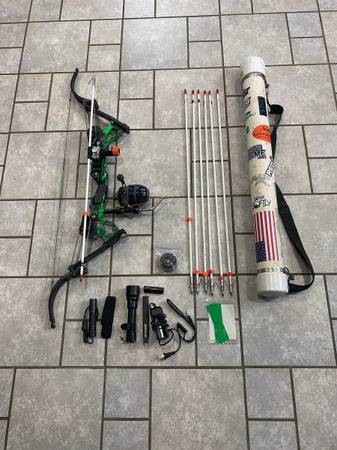Have a Oneida osprey bowfishing bow, fully rigged. It’s a medium in green deadfin color. 7 Arrows, arrow tube, ams light, outrigger light + spare battery, gargod savur bowfishing float combo, Oneida...